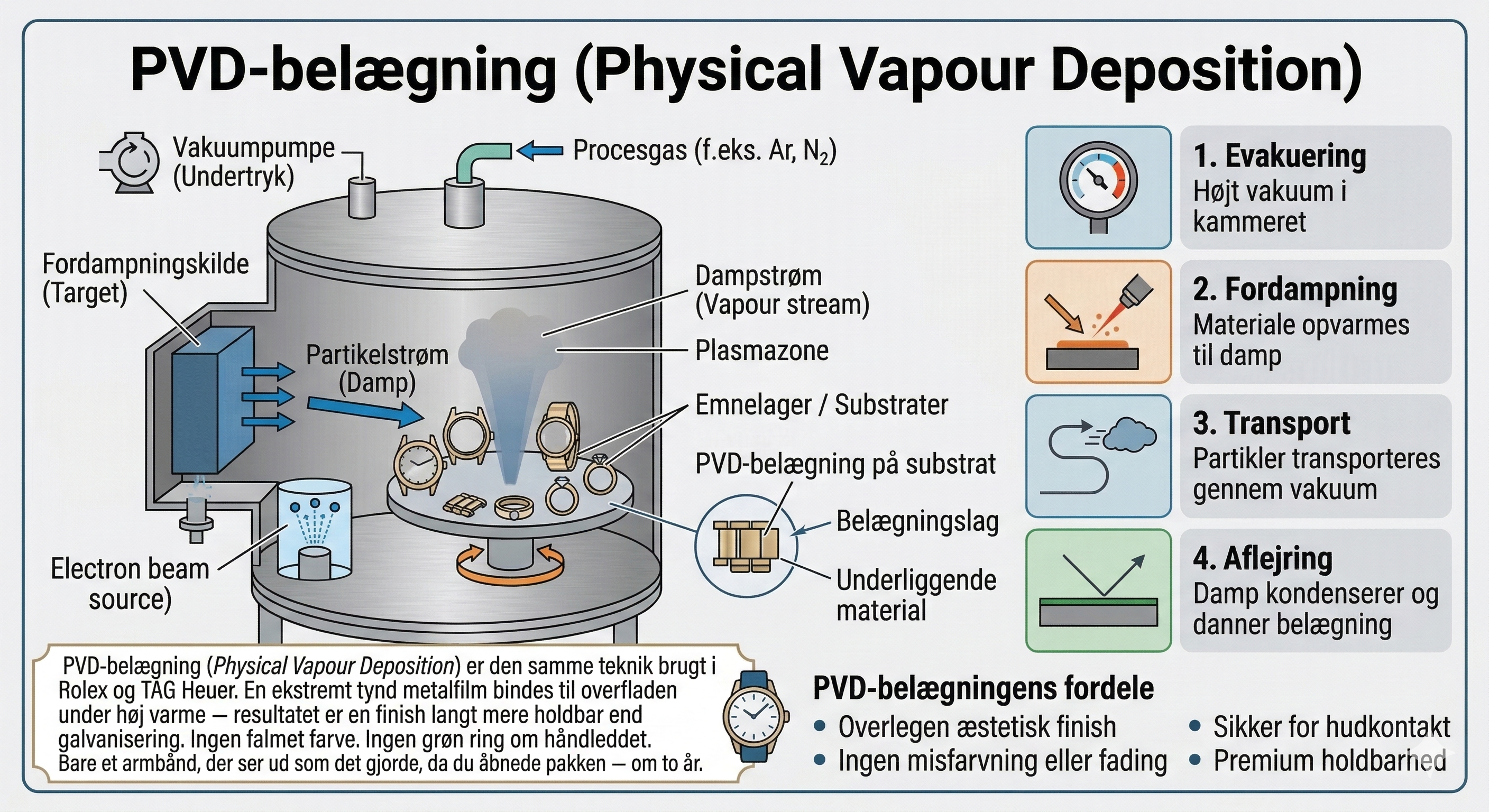 PVD-belægning (Physical Vapour Deposition) er den samme teknik brugt i Rolex og TAG Heuer. En ekstremt tynd metalfilm bindes til overfladen under høj varme — resultatet er en finish langt mere holdbar end galvanisering. Ingen falmet farve. Ingen grøn ring om håndleddet. Bare et smykke, der ser ud som det gjorde, da du åbnede pakken — om to år.