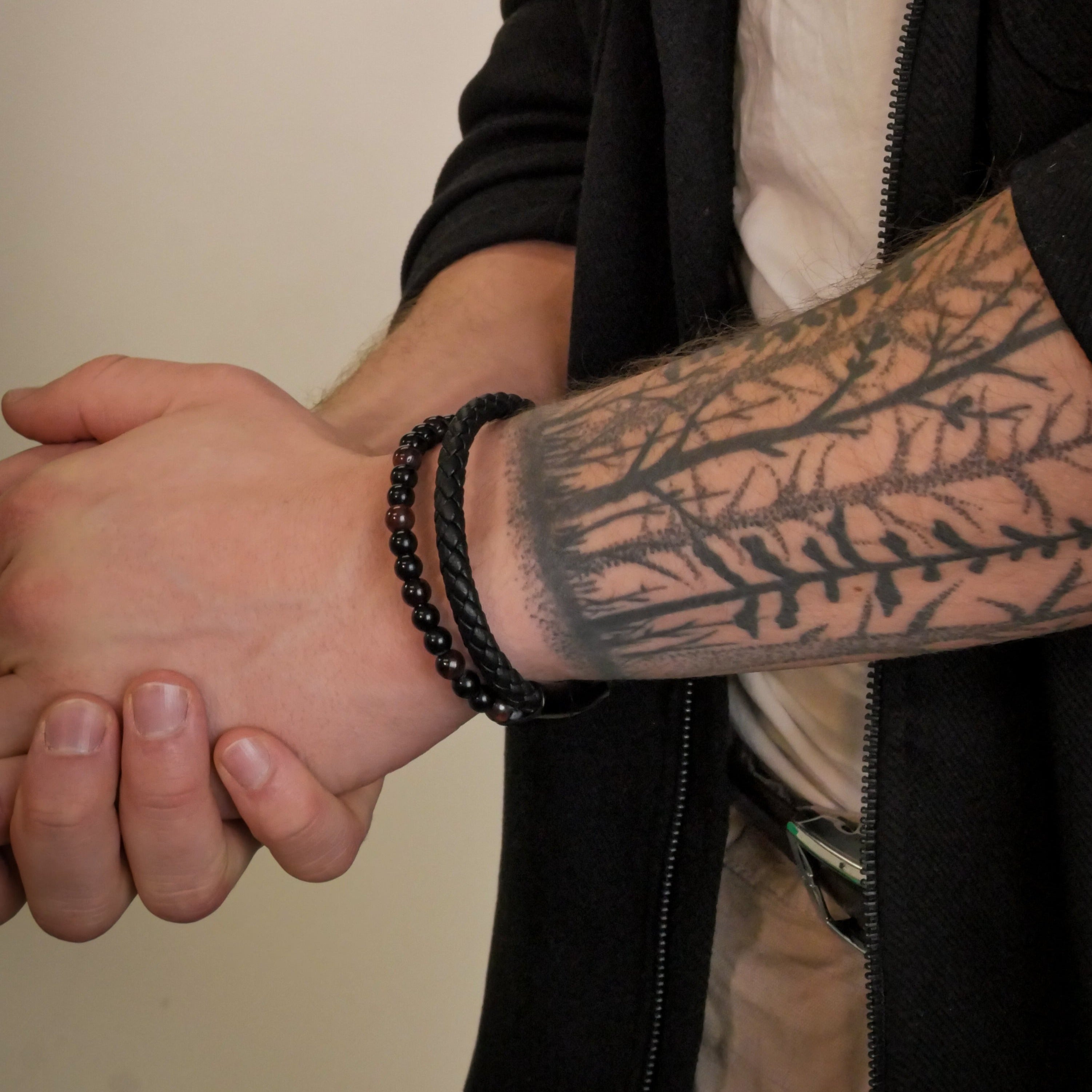 Each bead in the Fenrir bracelet is carefully selected based on its unique beauty and quality, ensuring that each bracelet is a one-of-a-kind masterpiece. Natural beads like red tiger's eye and black onyx stone beads are known for their deep, rich colors and the unique luster they add to any piece of jewelry. This careful selection process guarantees that each bead not only contributes its individual charm but also a deeper meaning and energy valued in many cultures around the world. By wearing the Fenrir bracelet, one not only wears a beautiful piece of jewelry but also a symbol of the earth's natural beauty and the powerful properties that these stones represent. This connection to nature and its timeless beauty is what makes the Fenrir Bracelet a true statement piece for any man who appreciates unique style and substance in his accessories.